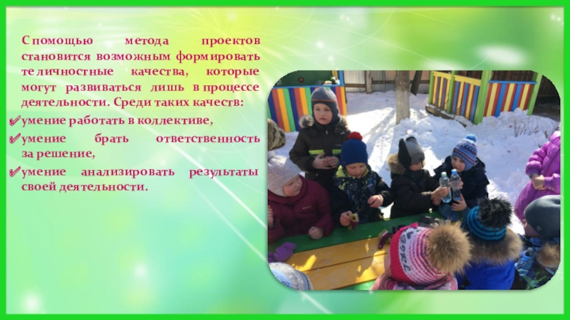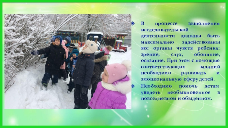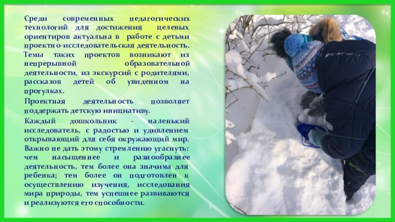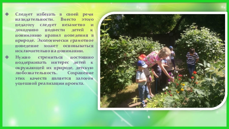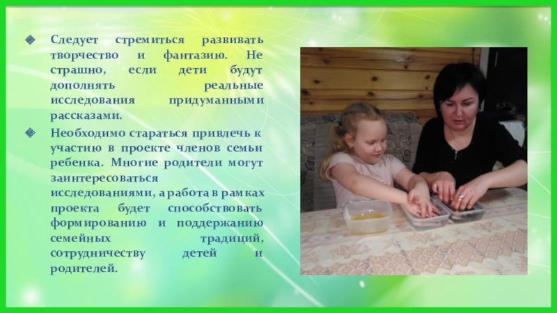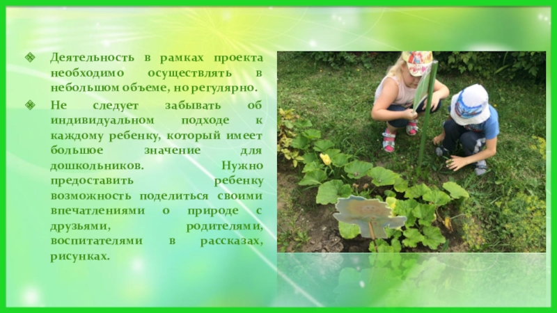 Работу следует организовать так, чтобы у каждого ребенка было желание участвовать в исследовательской деятельности, проявлять инициативу, чтобы дети осознавали, что экологический проект содержит такие задания, которые будут для него интересны и которые никто кроме него, не сможет выполнить.
