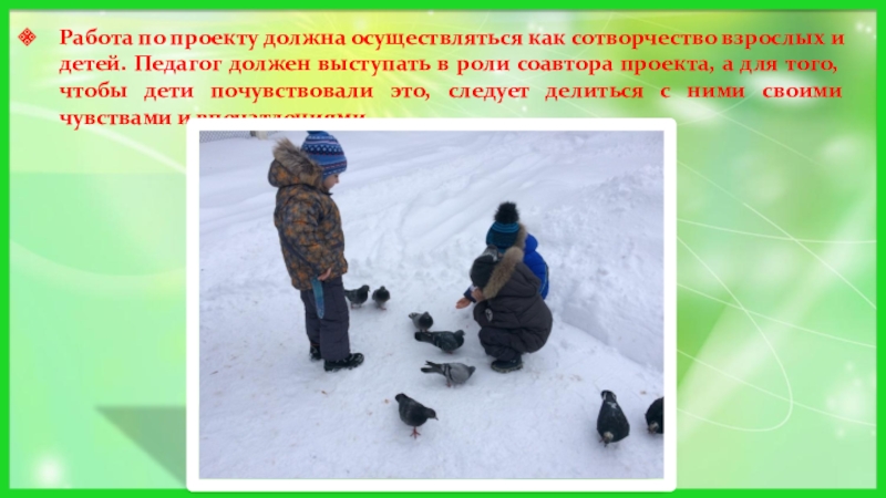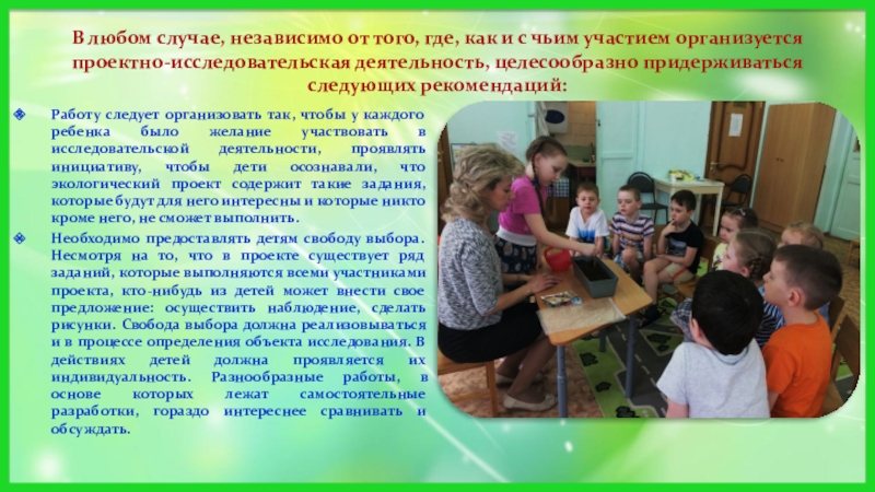 Необходимо предоставлять детям свободу выбора. Несмотря на то, что в проекте существует ряд заданий, которые выполняются всеми участниками проекта, кто-нибудь из детей может внести свое предложение: осуществить наблюдение, сделать рисунки. Свобода выбора должна реализовываться и в процессе определения объекта исследования. В действиях детей должна проявляется их индивидуальность. Разнообразные работы, в основе которых лежат самостоятельные разработки, гораздо интереснее сравнивать и обсуждать.