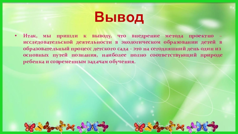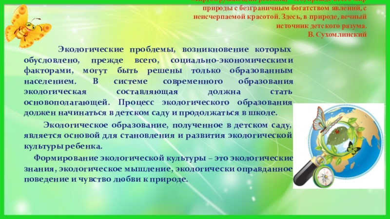 Экологические проблемы, возникновение которых обусловлено, прежде всего, социально-экономическими факторами, могут быть решены только образованным населением. В системе современного образования экологическая составляющая должна стать основополагающей. Процесс экологического образования должен начинаться в детском саду и продолжаться в школе.