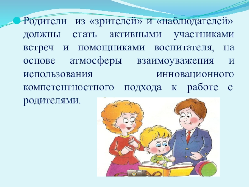 Слайд 9Родители из «зрителей» и «наблюдателей» должны стать активными участниками встреч и