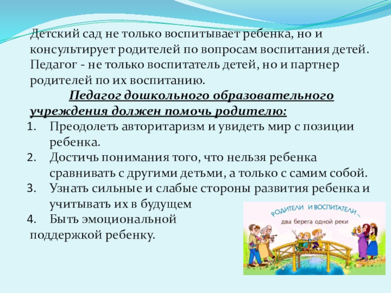 Слайд 6Детский сад не только воспитывает ребенка, но и консультирует родителей по