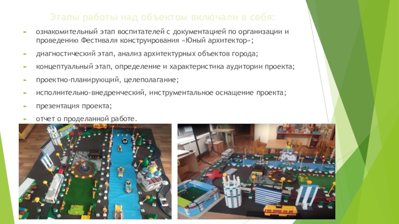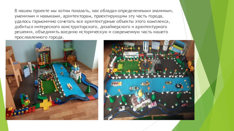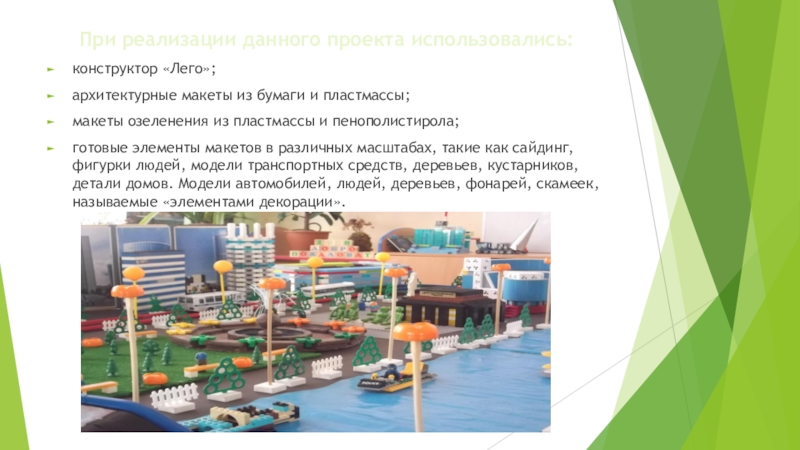 в проекте были привлечены и родители (законные представители) воспитанников. Воспитатель выслушала предложения воспитанников и родителей по проектной деятельности, выбрала участников, согласовала рабочие материалы, координировала работу, размещала совместно с детьми архитектурные объекты на макете, сочетала цветовую гамму. Все конструкции были выполнены детьми совместно с воспитателем и родителями.