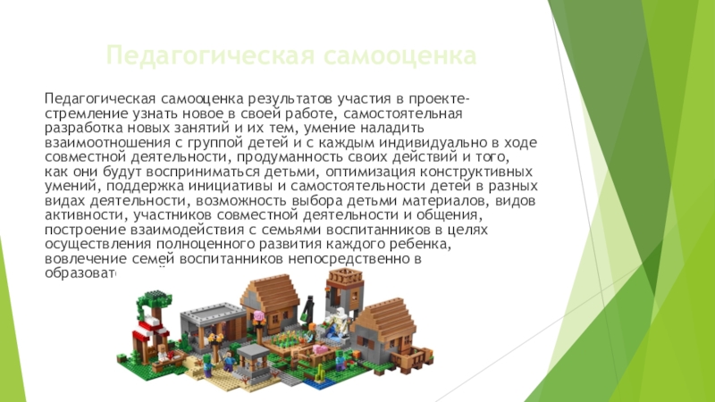 в своей работе, самостоятельная разработка новых занятий и их тем, умение наладить взаимоотношения с группой детей и с каждым индивидуально в ходе совместной деятельности, продуманность своих действий и того, как они будут восприниматься детьми, оптимизация конструктивных умений, поддержка инициативы и самостоятельности детей в разных видах деятельности, возможность выбора детьми материалов, видов активности, участников совместной деятельности и общения, построение взаимодействия с семьями воспитанников в целях осуществления полноценного развития каждого ребенка, вовлечение семей воспитанников непосредственно в образовательный процесс.