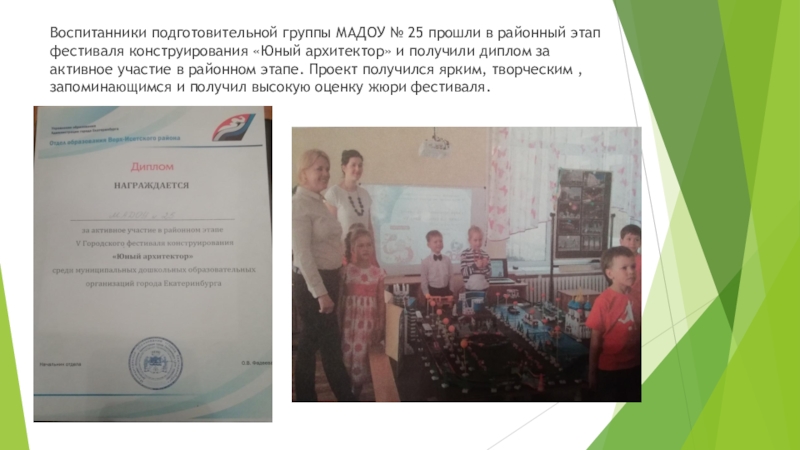 конструирования «Юный архитектор» и получили диплом за активное участие в районном этапе. Проект получился ярким, творческим , запоминающимся и получил высокую оценку жюри фестиваля.