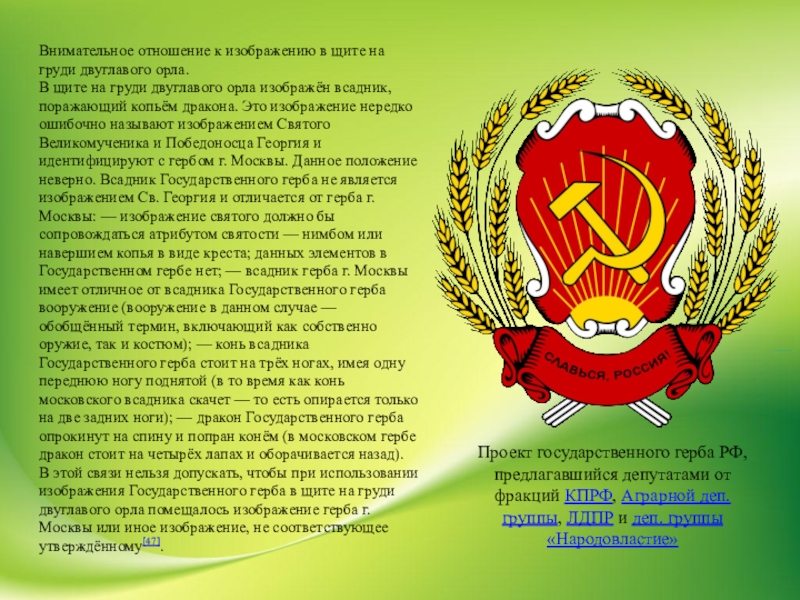 В щите на груди двуглавого орла изображён всадник, поражающий копьём дракона. Это изображение нередко ошибочно называют изображением Святого Великомученика и Победоносца Георгия и идентифицируют с гербом г. Москвы. Данное положение неверно. Всадник Государственного герба не является изображением Св. Георгия и отличается от герба г. Москвы: — изображение святого должно бы сопровождаться атрибутом святости — нимбом или навершием копья в виде креста; данных элементов в Государственном гербе нет; — всадник герба г. Москвы имеет отличное от всадника Государственного герба вооружение (вооружение в данном случае — обобщённый термин, включающий как собственно оружие, так и костюм); — конь всадника Государственного герба стоит на трёх ногах, имея одну переднюю ногу поднятой (в то время как конь московского всадника скачет — то есть опирается только на две задних ноги); — дракон Государственного герба опрокинут на спину и попран конём (в московском гербе дракон стоит на четырёх лапах и оборачивается назад).