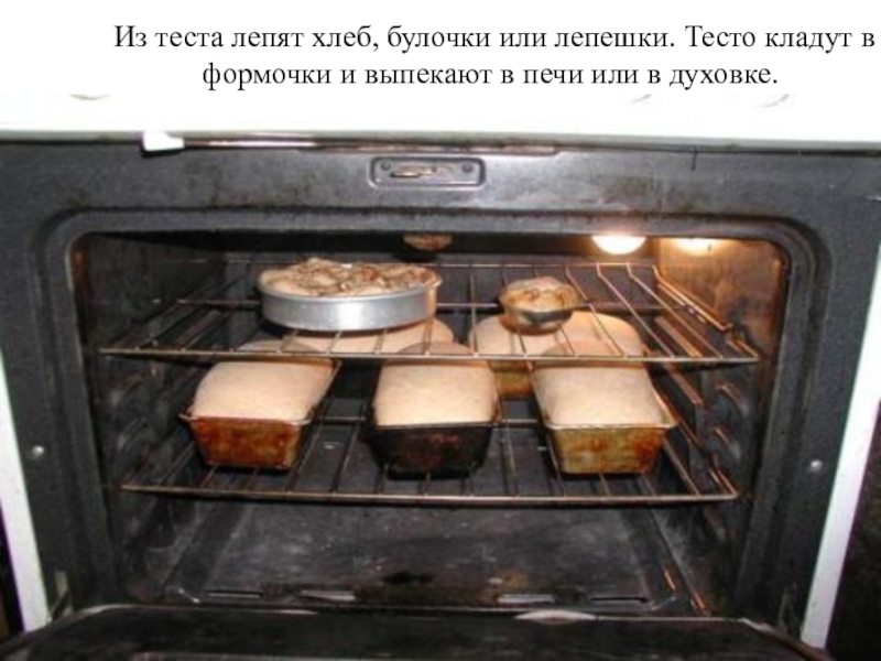 Слайд 13Из теста лепят хлеб, булочки или лепешки. Тесто кладут в формочки