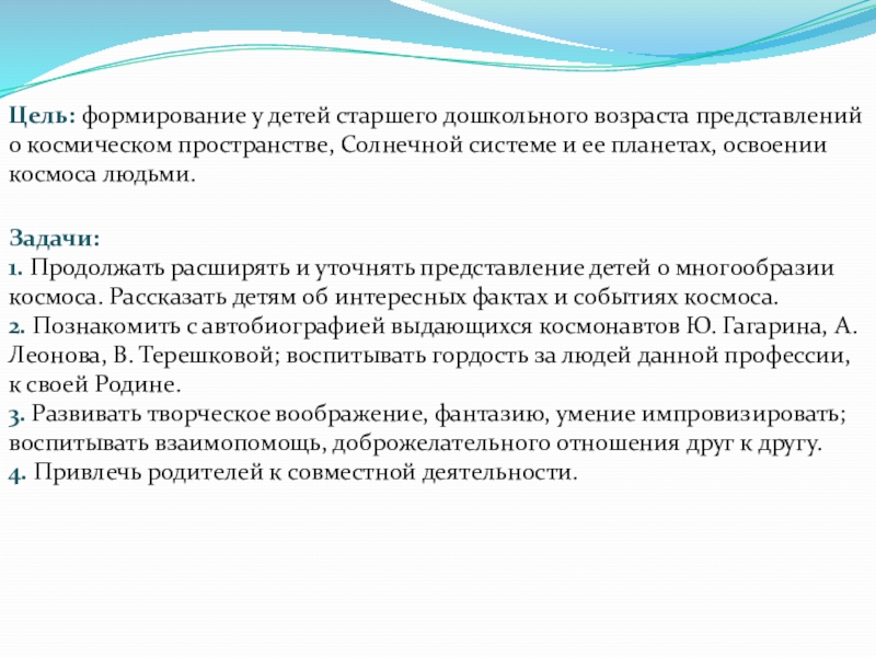 2. Познакомить с автобиографией выдающихся космонавтов Ю. Гагарина, А. Леонова, В. Терешковой; воспитывать гордость за людей данной профессии, к своей Родине.