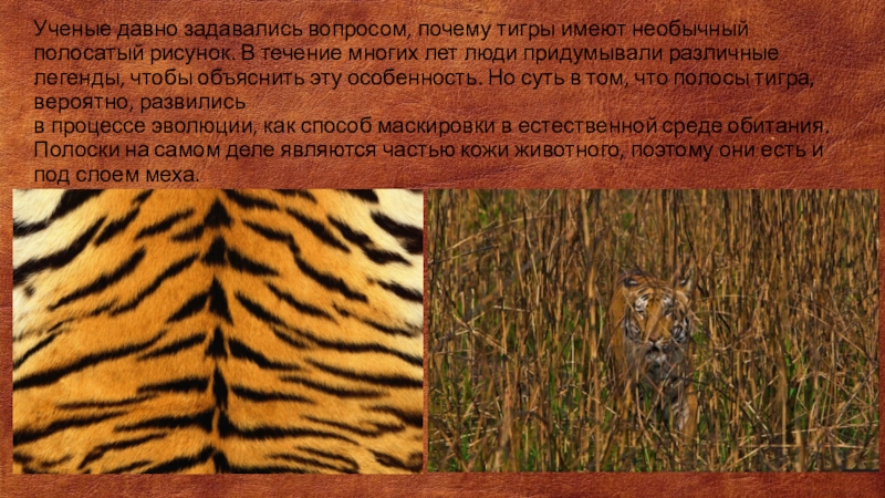 Слайд 6Ученые давно задавались вопросом, почему тигры имеют необычный полосатый рисунок. В