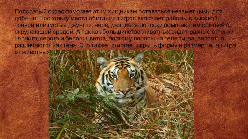 Слайд 7Полосатый окрас помогает этим хищникам оставаться незаметными для добычи. Поскольку места