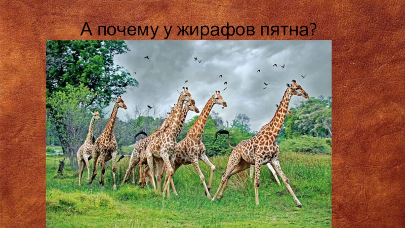 Слайд 13Пятнистый окрас служит отличным камуфляжем и помогает жирафам маскироваться от хищников