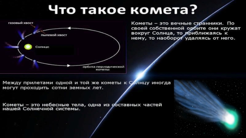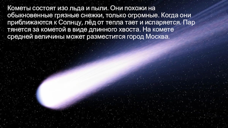 снежки, только огромные. Когда они приближаются к Солнцу, лёд от тепла тает и испаряется. Пар тянется за кометой в виде длинного хвоста. На комете средней величины может разместится город Москва.