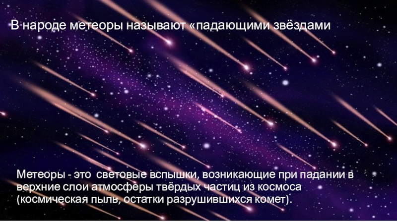 В народе метеоры называют «падающими звёздами Метеоры - это световые вспышки, возникающие при падании в верхние слои
