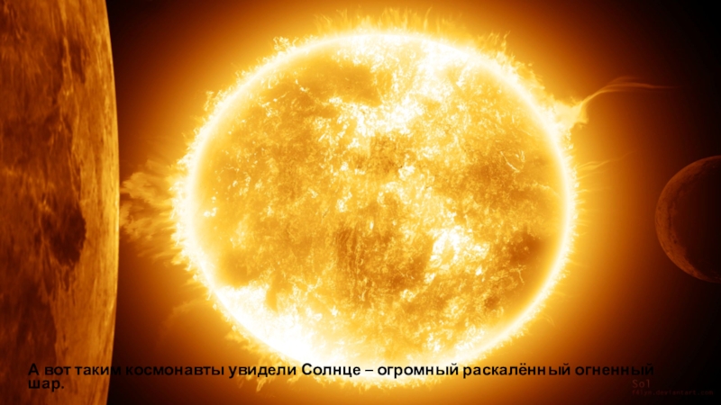Слайд 12А вот таким космонавты увидели Солнце – огромный раскалённый огненный шар.