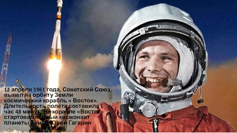 12 апреля 1961 года, Советский Союз вывел на орбиту Земли космический корабль « Восток». Длительность полёта составила