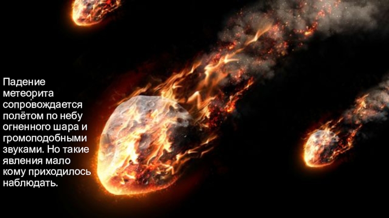 Слайд 21Падение метеорита сопровождается полётом по небу огненного шара и громоподобными звуками.