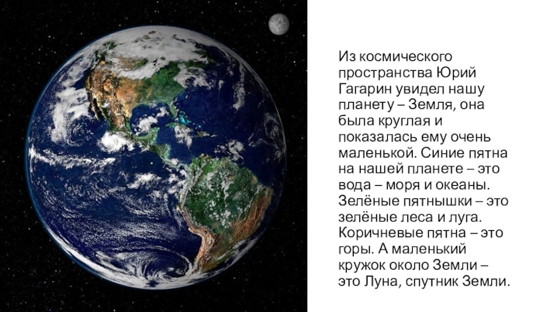 была круглая и показалась ему очень маленькой. Синие пятна на нашей планете – это вода – моря и океаны. Зелёные пятнышки – это зелёные леса и луга. Коричневые пятна – это горы. А маленький кружок около Земли – это Луна, спутник Земли.