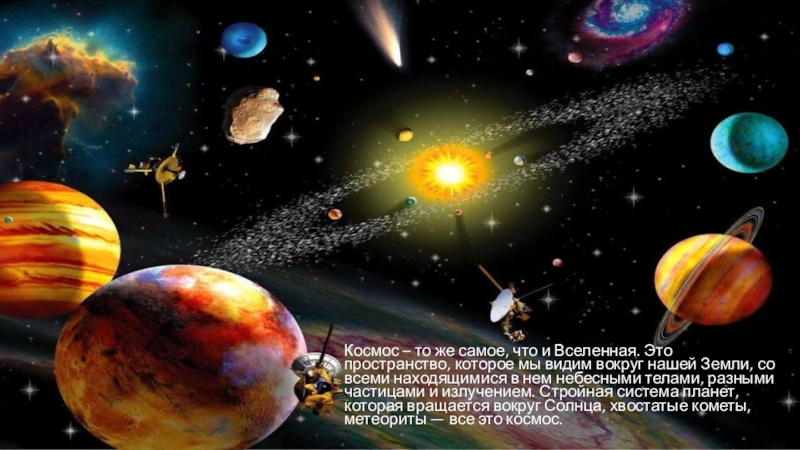мы видим вокруг нашей Земли, со всеми находящимися в нем небесными телами, разными частицами и излучением. Стройная система планет, которая вращается вокруг Солнца, хвостатые кометы, метеориты — все это космос.
