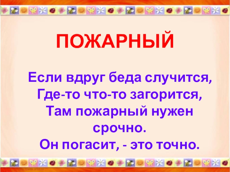 ПОЖАРНЫЙ  Если вдруг беда случится, Где-то что-то загорится, Там пожарный нужен срочно. Он погасит, - это