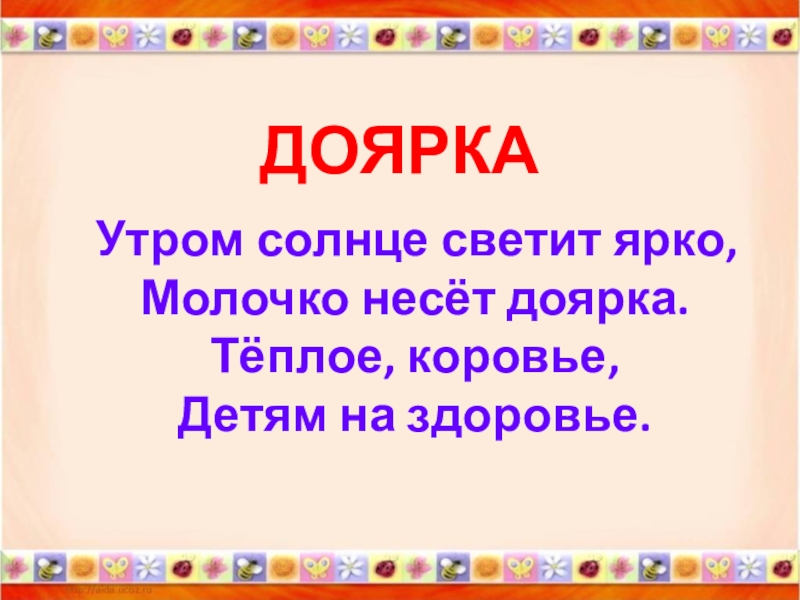 ДОЯРКА   Утром солнце светит ярко, Молочко несёт доярка. Тёплое, коровье, Детям на здоровье.