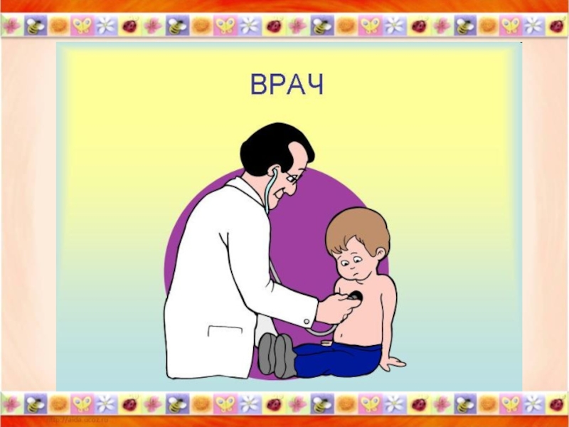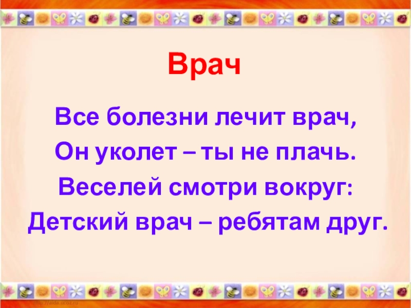 Врач Все болезни лечит врач,Он уколет – ты не плачь.Веселей смотри вокруг:Детский врач – ребятам друг.