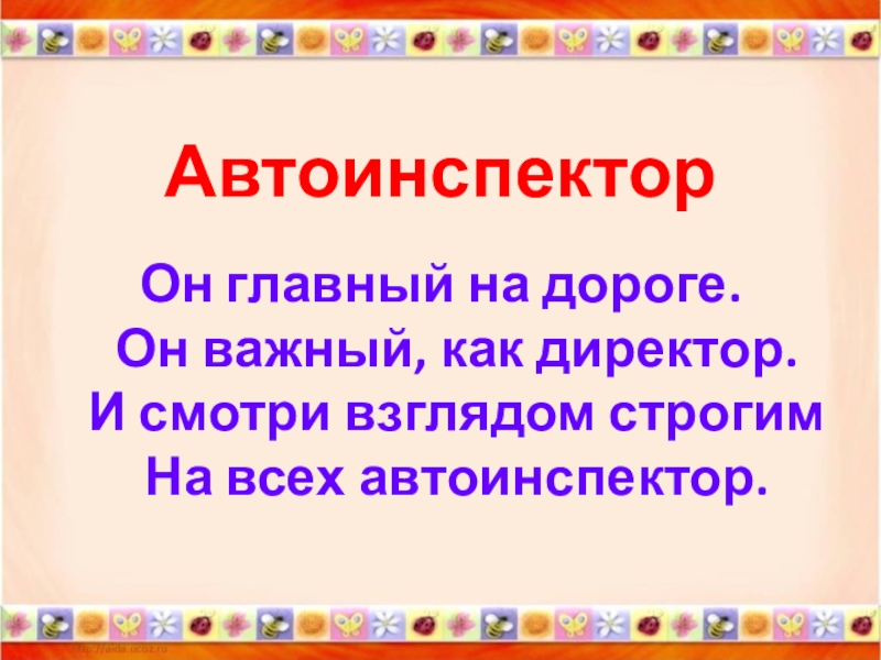 Автоинспектор Он главный на дороге. Он важный, как директор. И смотри взглядом строгим На всех автоинспектор.