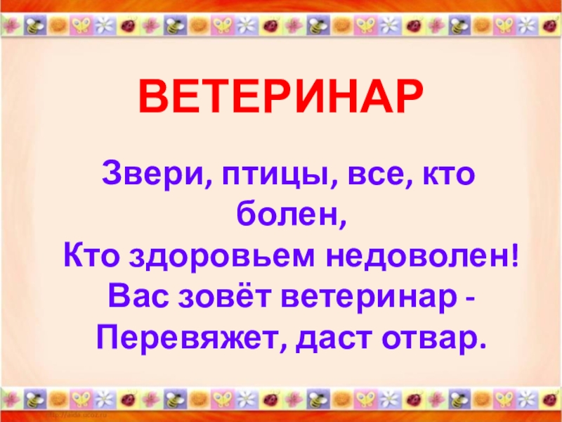 ВЕТЕРИНАР Звери, птицы, все, кто болен, Кто здоровьем недоволен! Вас зовёт ветеринар - Перевяжет, даст отвар.