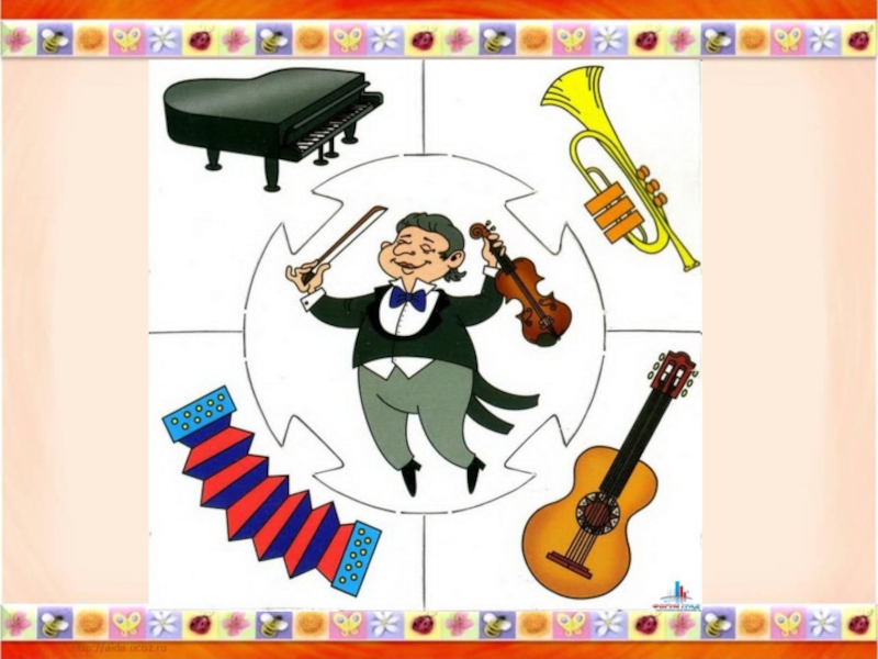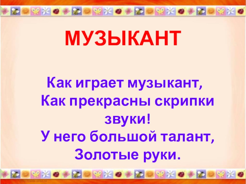 МУЗЫКАНТ Как играет музыкант, Как прекрасны скрипки звуки! У него большой талант, Золотые руки.