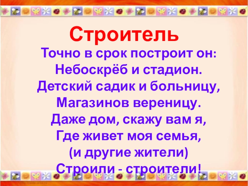 Детский садик и больницу, Магазинов вереницу. Даже дом, скажу вам я, Где живет моя семья, (и другие жители) Строили - строители!