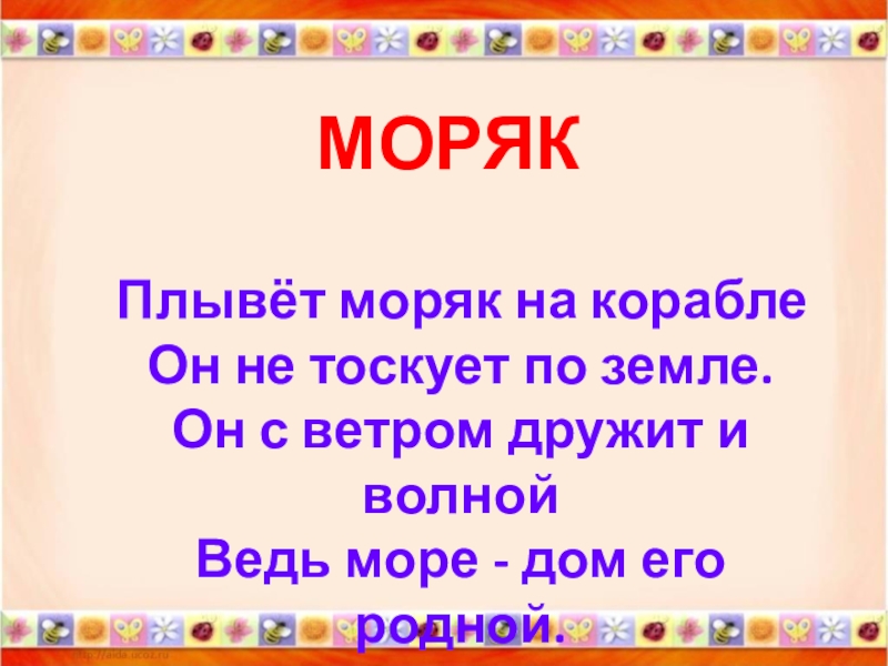 МОРЯК   Плывёт моряк на корабле Он не тоскует по земле. Он с ветром дружит и