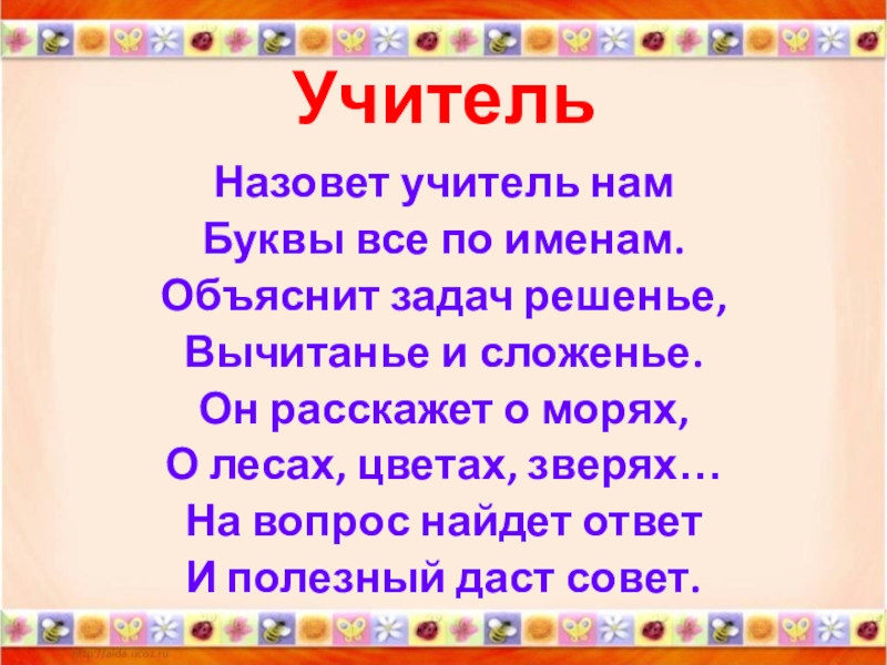 Учитель Назовет учитель намБуквы все по именам.Объяснит задач решенье,Вычитанье и сложенье.Он расскажет о морях,О лесах, цветах, зверях…На