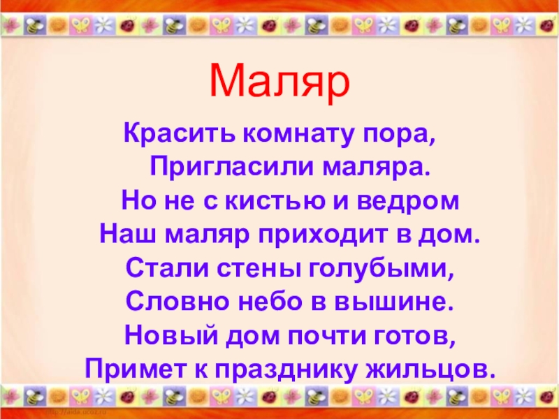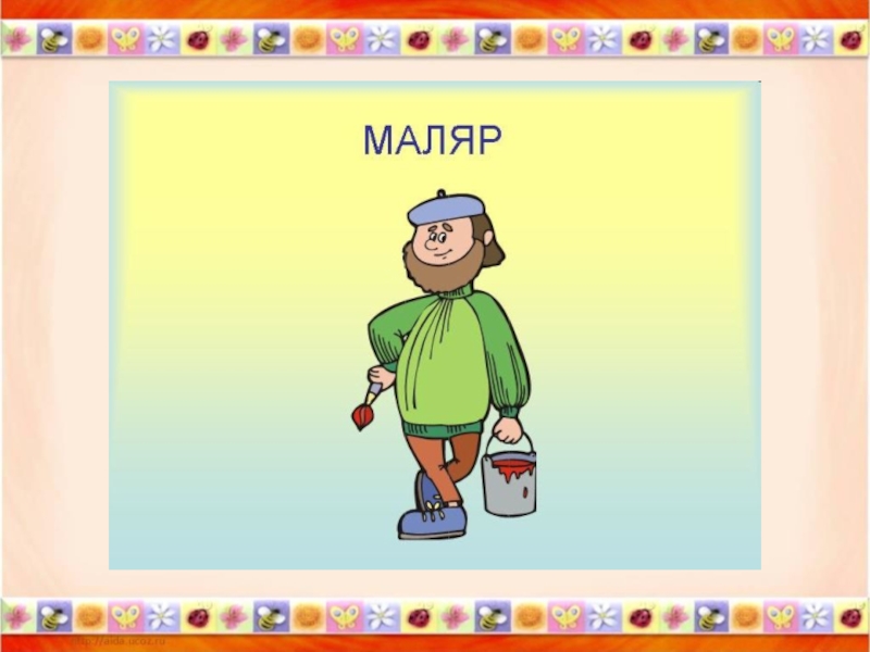 Маляр Красить комнату пора, Пригласили маляра. Но не с кистью и ведром Наш маляр приходит в дом.