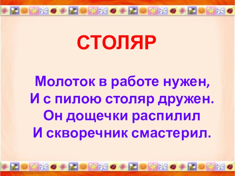 СТОЛЯР   Молоток в работе нужен, И с пилою столяр дружен. Он дощечки распилил И скворечник