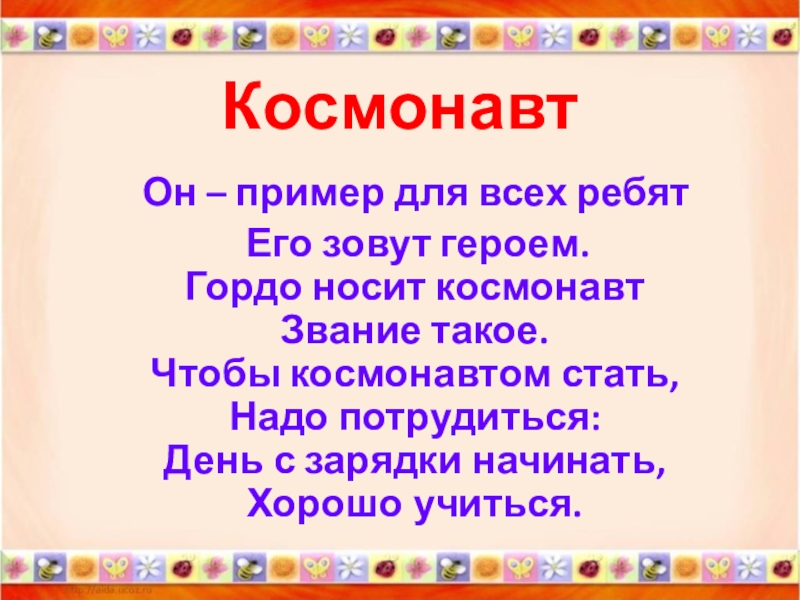 зовут героем. Гордо носит космонавт Звание такое. Чтобы космонавтом стать, Надо потрудиться: День с зарядки начинать, Хорошо учиться.
