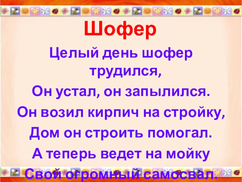 Шофер Целый день шофер трудился,Он устал, он запылился.Он возил кирпич на стройку,Дом он строить помогал.А теперь ведет