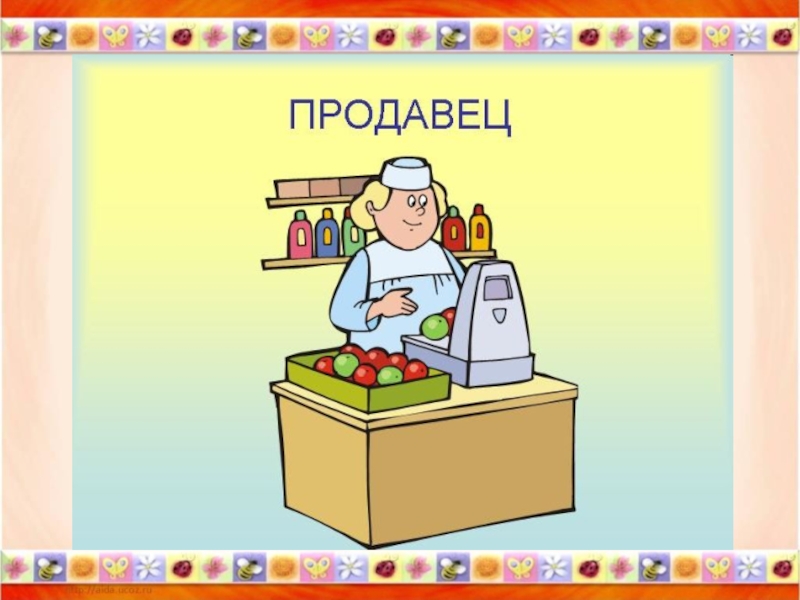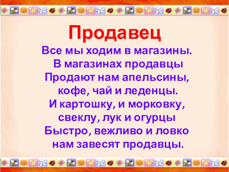 Продавец Все мы ходим в магазины. В магазинах продавцыПродают нам апельсины, кофе, чай и леденцы.И картошку, и