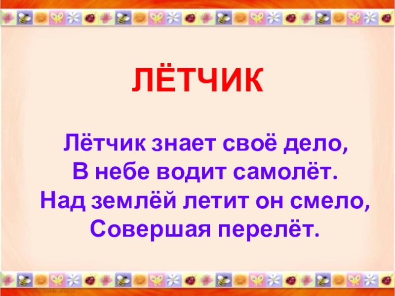 ЛЁТЧИК  Лётчик знает своё дело, В небе водит самолёт. Над землёй летит он смело, Совершая перелёт.