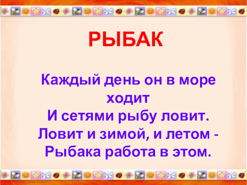 РЫБАК   Каждый день он в море ходит И сетями рыбу ловит. Ловит и зимой, и