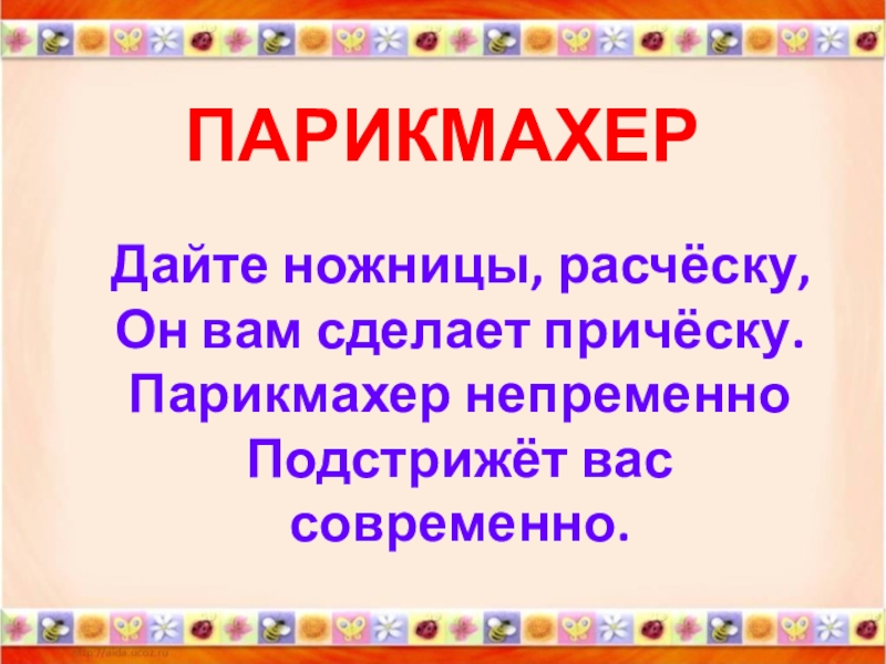ПАРИКМАХЕР  Дайте ножницы, расчёску, Он вам сделает причёску. Парикмахер непременно Подстрижёт вас современно.