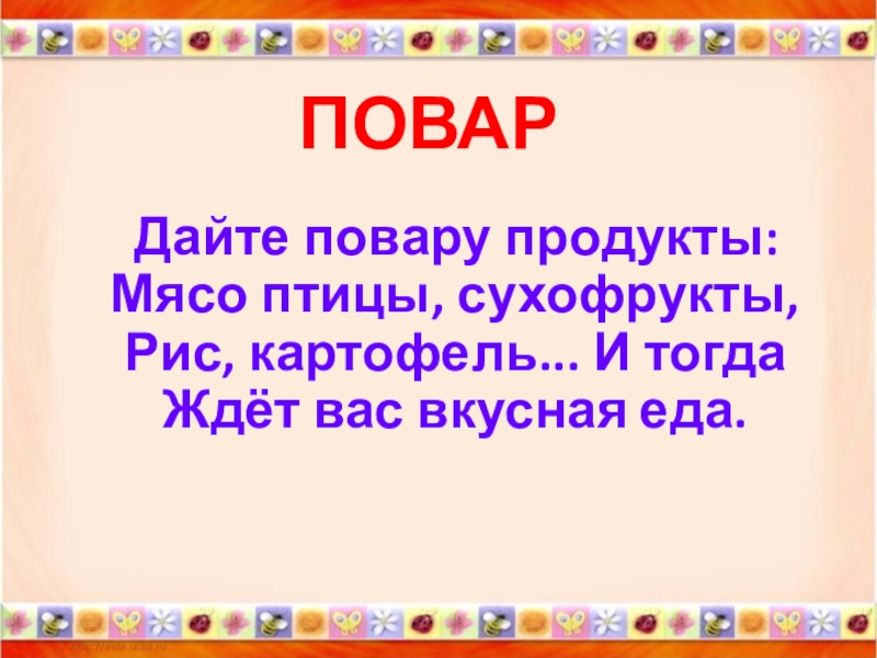 ПОВАР   Дайте повару продукты: Мясо птицы, сухофрукты, Рис, картофель... И тогда  Ждёт вас вкусная