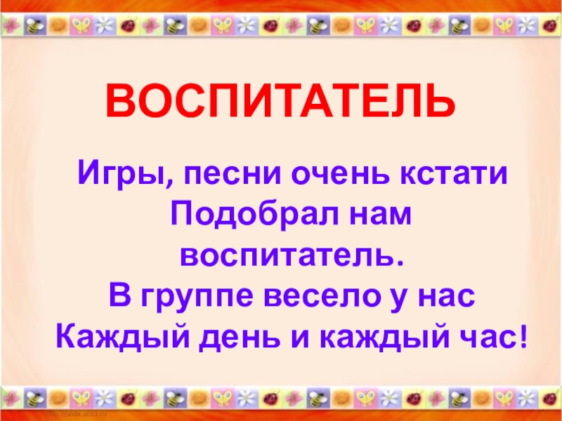 ВОСПИТАТЕЛЬ  Игры, песни очень кстати Подобрал нам воспитатель. В группе весело у нас Каждый день и