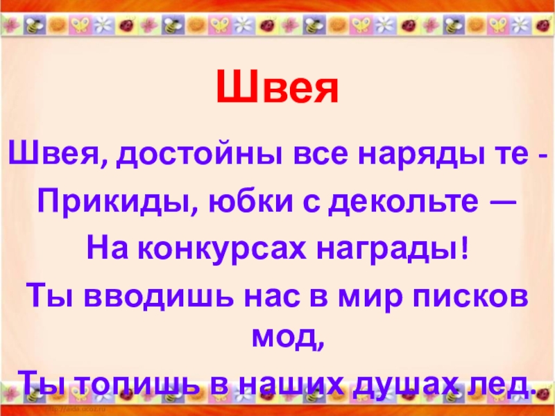 Швея Швея, достойны все наряды те -Прикиды, юбки с декольте —На конкурсах награды!Ты вводишь нас в мир