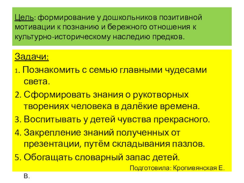 2. Сформировать знания о рукотворных творениях человека в далёкие времена.