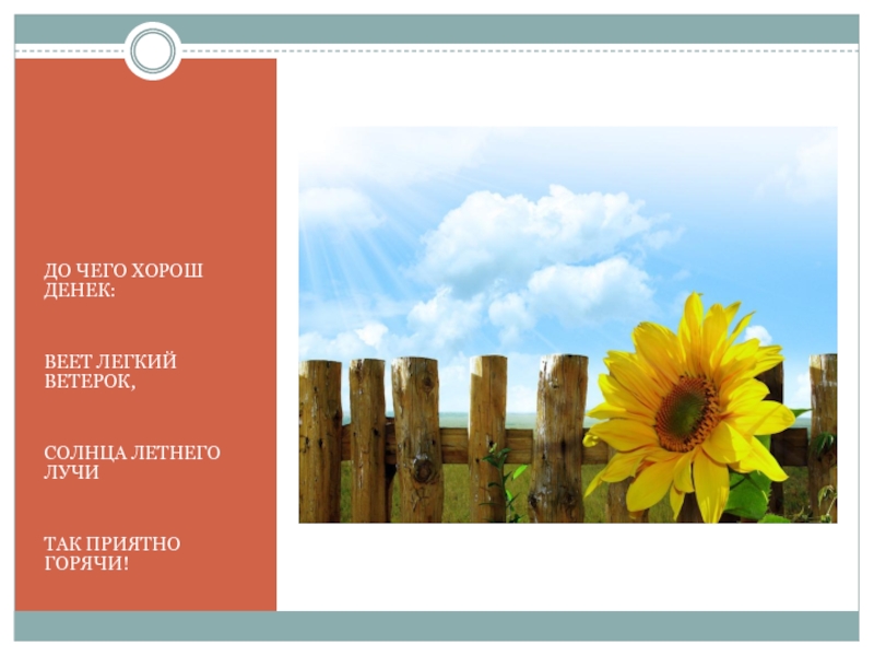 ДО ЧЕГО ХОРОШ ДЕНЕК:ВЕЕТ ЛЕГКИЙ ВЕТЕРОК,СОЛНЦА ЛЕТНЕГО ЛУЧИТАК ПРИЯТНО ГОРЯЧИ!