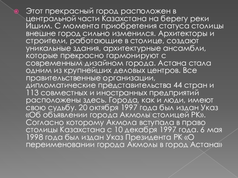 Ишим. С момента приобретения статуса столицы внешне город сильно изменился. Архитекторы и строители, работающие в столице, создают уникальные здания, архитектурные ансамбли, которые прекрасно гармонируют с современным дизайном города. Астана стала одним из крупнейших деловых центров. Все правительственные организации, дипломатические представительства 44 стран и 113 совместных и иностранных предприятий расположены здесь. Города, как и люди, имеют свою судьбу. 20 октября 1997 года был издан Указ «Об объявлении города Акмолы столицей РК». Согласно которому Акмола вступала в право столицы Казахстана с 10 декабря 1997 года. 6 мая 1998 года был издан Указ Президента РК «О переименовании города Акмолы в город Астана»