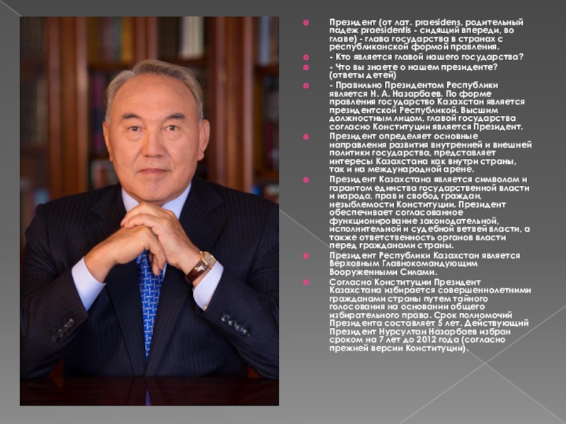 - Правильно Президентом Республики является Н. А. Назарбаев. По форме правления государство Казахстан является президентской Республикой. Высшим должностным лицом, главой государства согласно Конституции является Президент.
