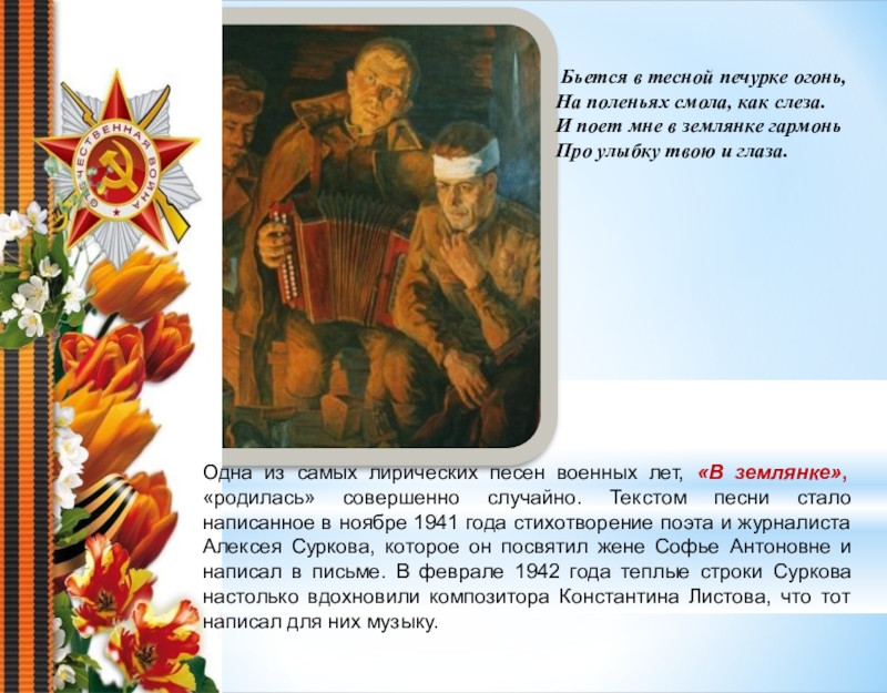 Одна из самых лирических песен военных лет, «В землянке», «родилась» совершенно случайно. Текстом песни стало написанное в ноябре 1941 года стихотворение поэта и журналиста Алексея Суркова, которое он посвятил жене Софье Антоновне и написал в письме. В феврале 1942 года теплые строки Суркова настолько вдохновили композитора Константина Листова, что тот написал для них музыку.