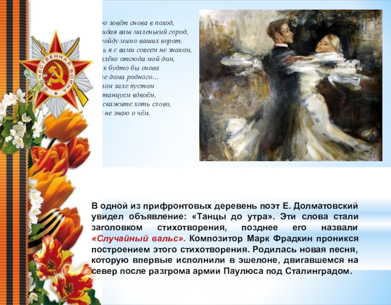 В одной из прифронтовых деревень поэт Е. Долматовский увидел объявление: «Танцы до утра». Эти слова стали заголовком стихотворения, позднее его назвали «Случайный вальс». Композитор Марк Фрадкин проникся построением этого стихотворения. Родилась новая песня, которую впервые исполнили в эшелоне, двигавшемся на север после разгрома армии Паулюса под Сталинградом.