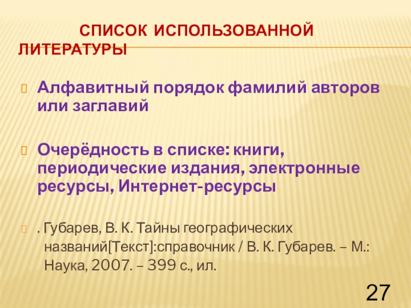 Очерёдность в списке: книги, периодические издания, электронные ресурсы, Интернет-ресурсы