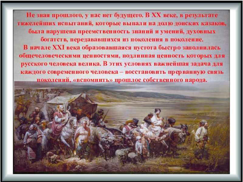 результате тяжелейших испытаний, которые выпали на долю донских казаков, была нарушена преемственность знаний и умений, духовных богатств, передававшихся из поколения в поколение.