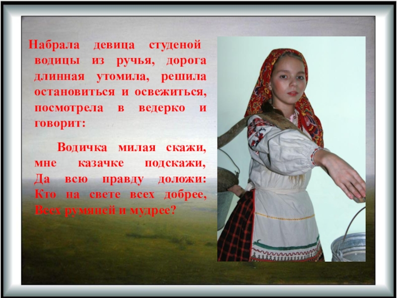 Водичка милая скажи, мне казачке подскажи, Да всю правду доложи: Кто на свете всех добрее, Всех румяней и мудрее?